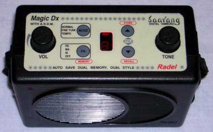 The 'Saarang Magic DX' produces the plucked sound of a conventional stringed tambura (tanpura) used for classical Indian music. The sound is produced electronically without the use of any strings. It employs the latest microcontroller and hybrid IC technology. The 'Saarang' plays by itself and does not need a person to play it.