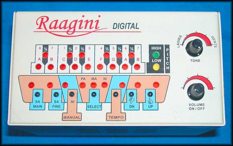 Specially for nadaswaram and shehnai artists, with three automatically tuned notes shadjam, pancham and mandara shadjam (kharaj). Sleek ABS plastic cabinet, size : 230 x135 x 90 mm, weight approx.1kg.